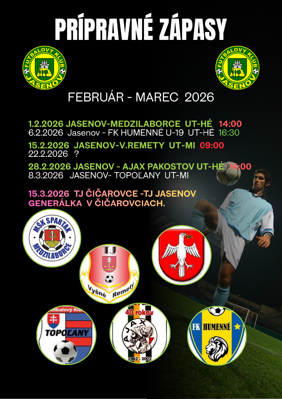 130.8.2023Dulova Ves-Jasenov0:1(0:0)V213.8.2023Soľ-Jasenov1:3 (1:1)P319.8.2023Svit-Jasenov5:9 (0:4)V427.8.2023Jasenov-Š.Dravce6:0 (4:0)V53.9.2023Župčany-Jasenov0:1 (0:0)V610.9.2023Jasenov-Spiš.Belá4:0 (1:0)V717.9.2023N.Hrušov-Jasenov 1:4 (0:2)V824.9.2023Jasenov-Demjata2:0(1:0)V91.10.2023Bystré-Jasenov3:1(1:1)P108.10.2023Jasenov-Marhaň2:0(1:0)V1115.10.2023 Kračúnovce-Jasenov 1:2(0:1)V1222.10.2023Jasenov-Zámutov1:1(0:1)R1329.10.2023Záhradné-Jasenov1:0(0:0)P145.11.2023Jasenov-Dulova Ves1:0(0:0)V